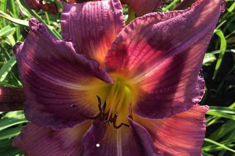 Grayish-violet blooms, a dark purple eye-zone, and a green throat.