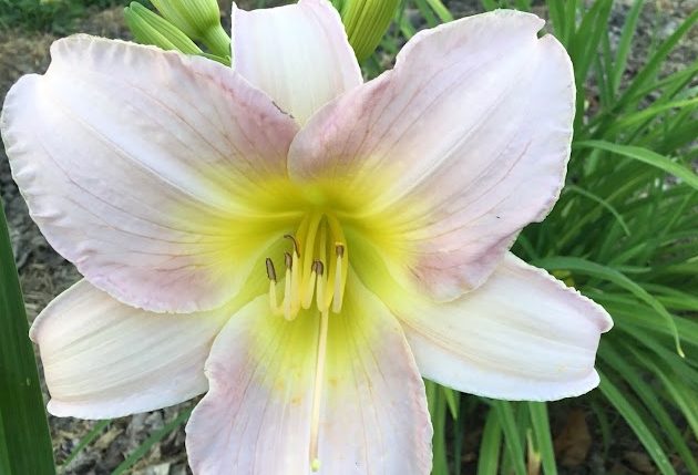 Delicately pale pink and cream with lavender overtones, with a throat of glowing chartreuse, and yellow centers.