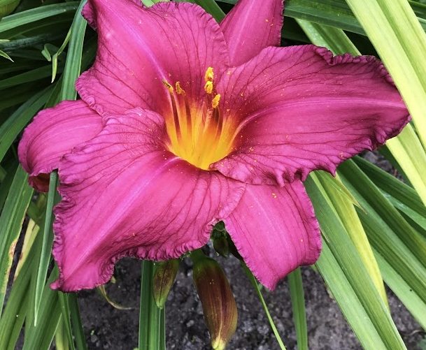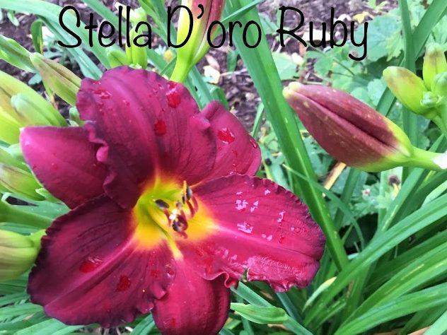 Ruby red flowers with ruffled edges and contrasting yellow & green throat. Reblooms in continuous display of blooms.