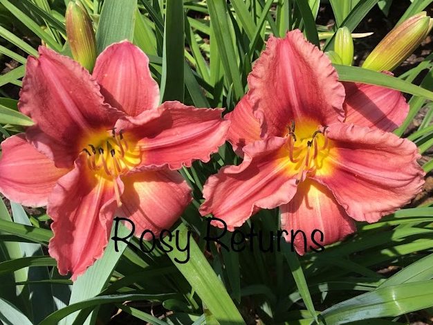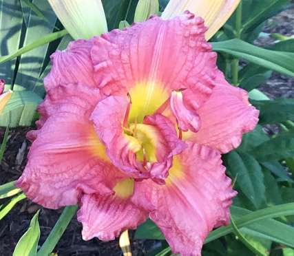 Rose-pink flowers, deep rose eye & yellow throat. It's a compact, early bloomer blooming consistently from June to frost.